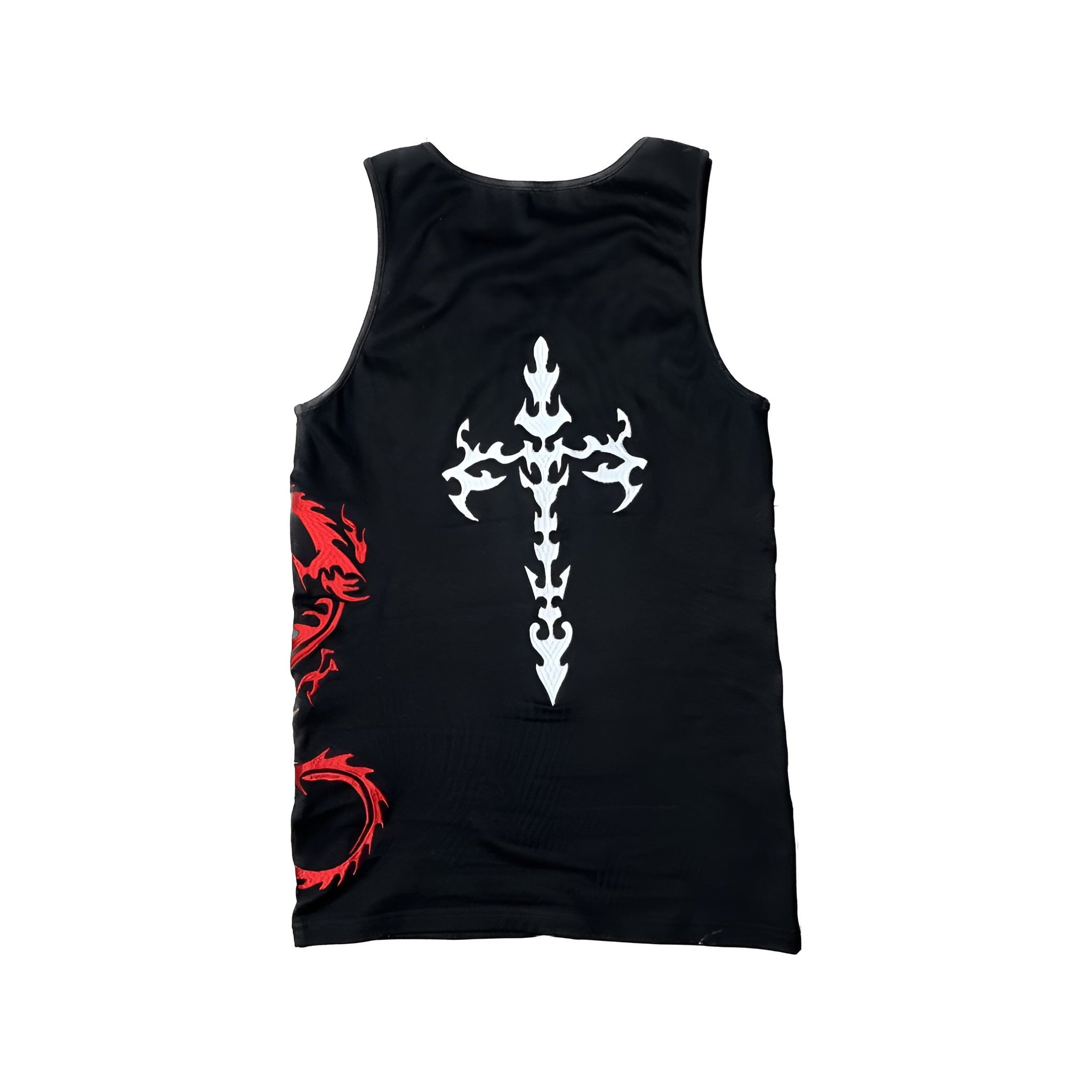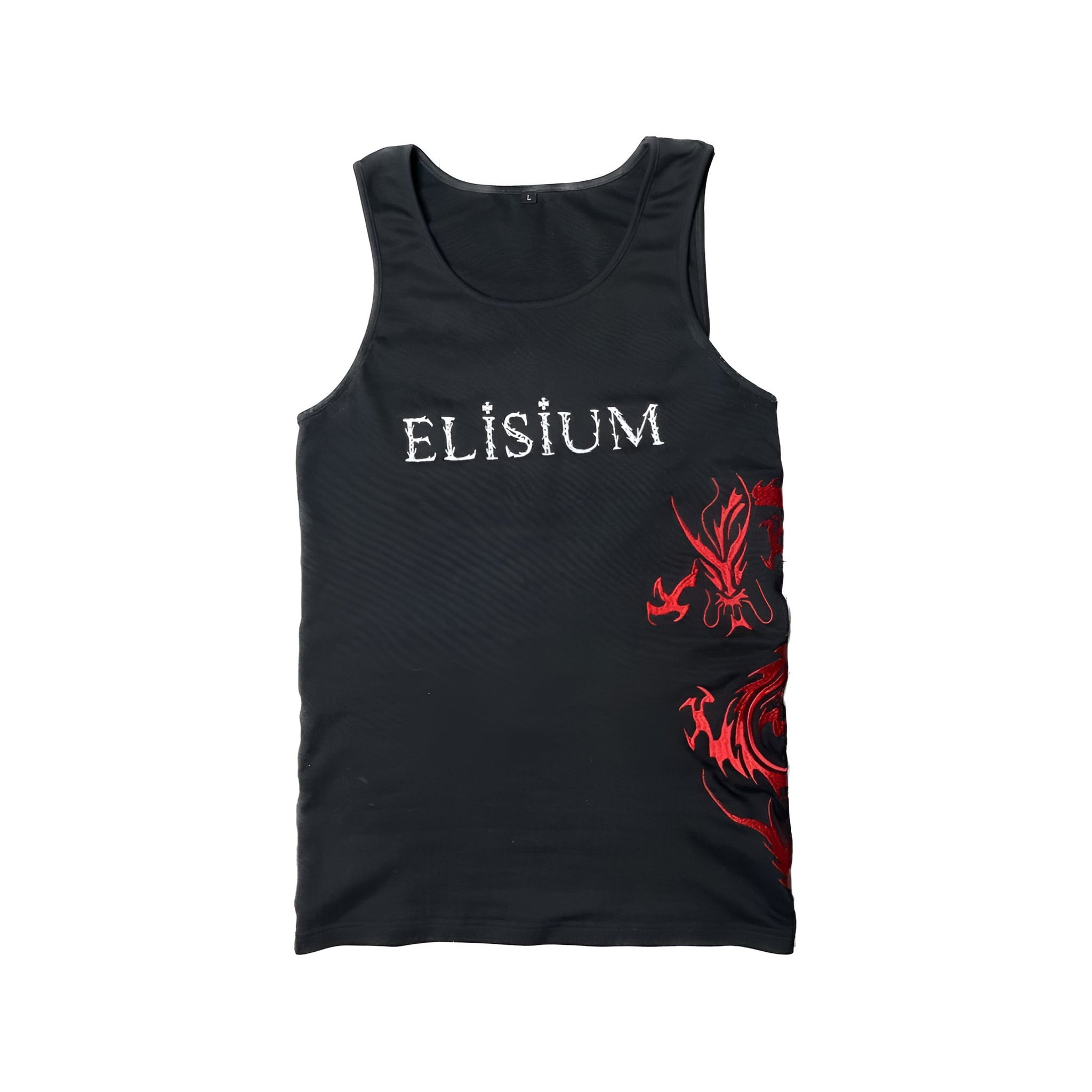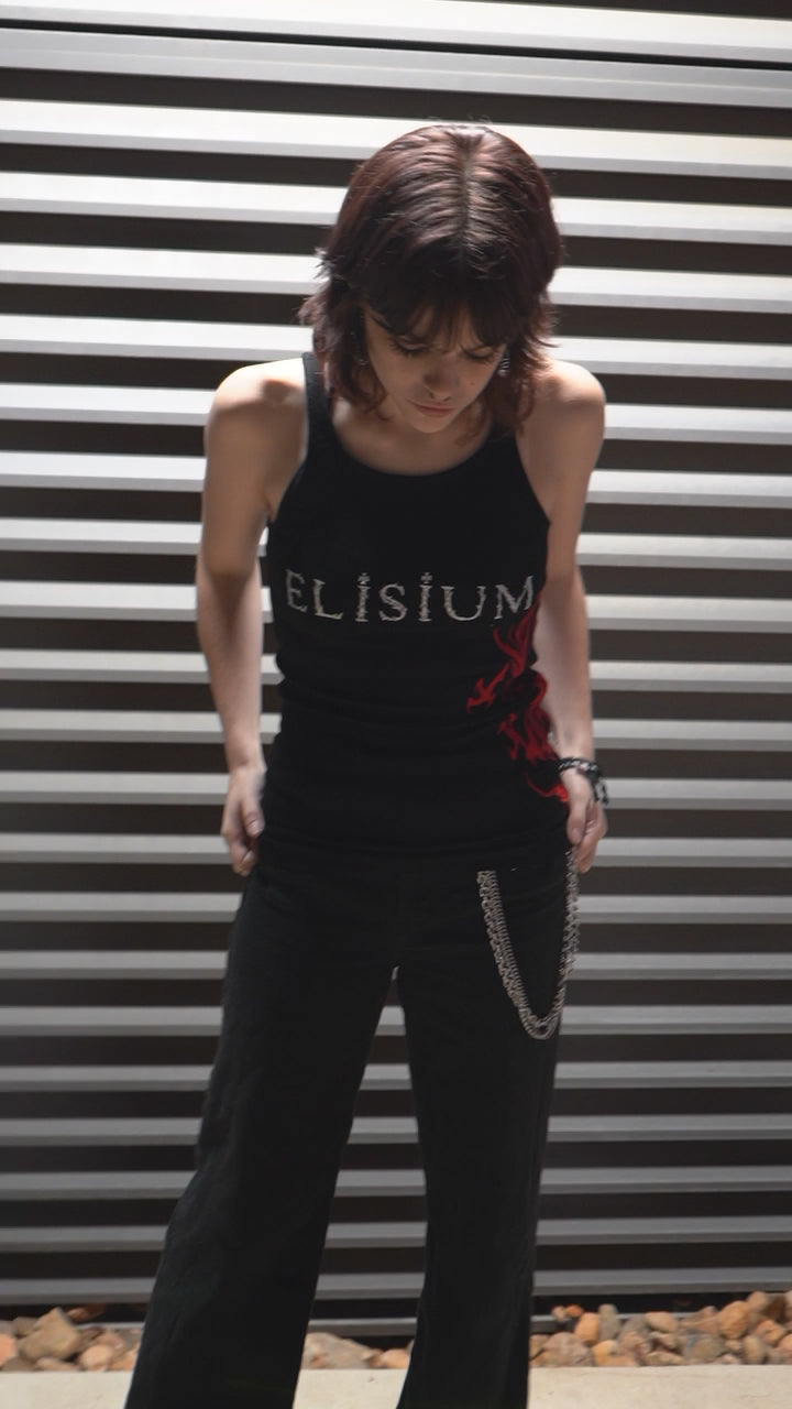 The Signature Elisium Opus 1 Dragon Tank Top in Deepest Blackย with White and Ruby Dragon Embroidery.ย
